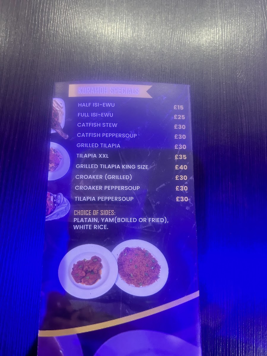 Welcome to Kuramoh Lounge Pan-African Restaurant, a vibrant culinary hub located in London. Our menu is a celebration of flavors across the African continent, showcasing an array of dishes that cater to every palate. The Ayamashe Special is a standout, featuring authentic plain white rice paired with the rich, spicy Ayamashe sauce for just £16.99. For a heartwarming experience, try our delectable Pepper Soups, with options ranging from chicken to goatmeat, each crafted to perfection.